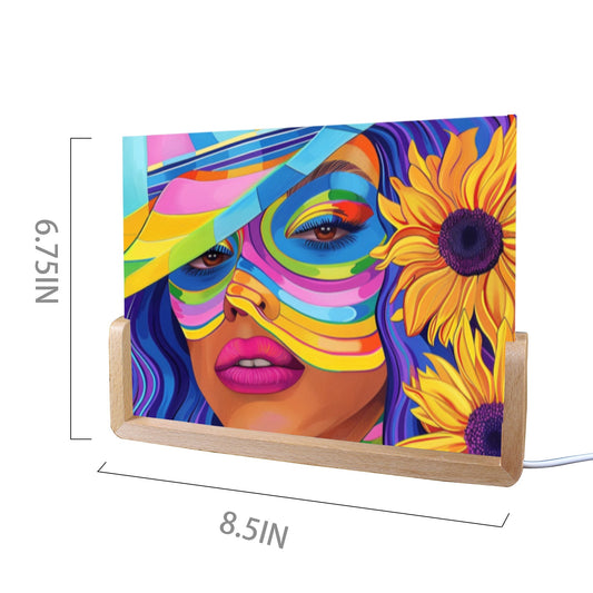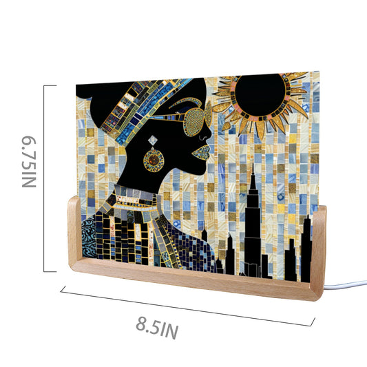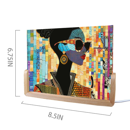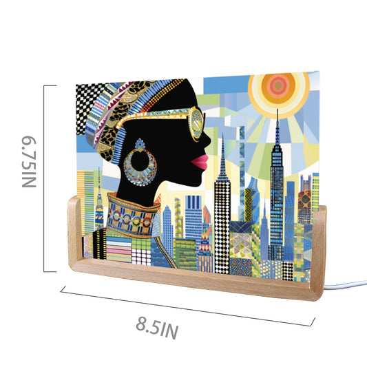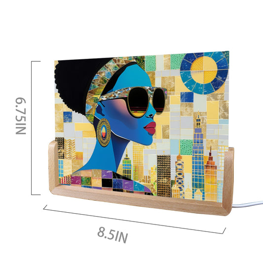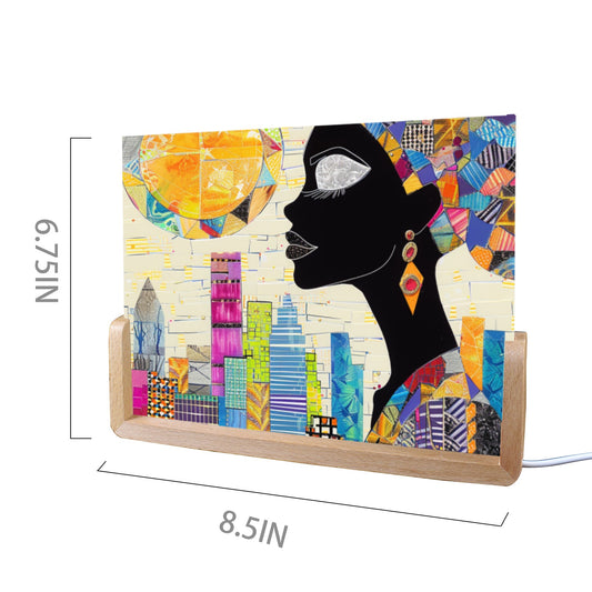 Acrylic Photo Night Light - Black Girl Art - Velvet's View - Urban Elegance - Illuminated in Color Collection - 8"x6"(U-Shaped Beech Base)