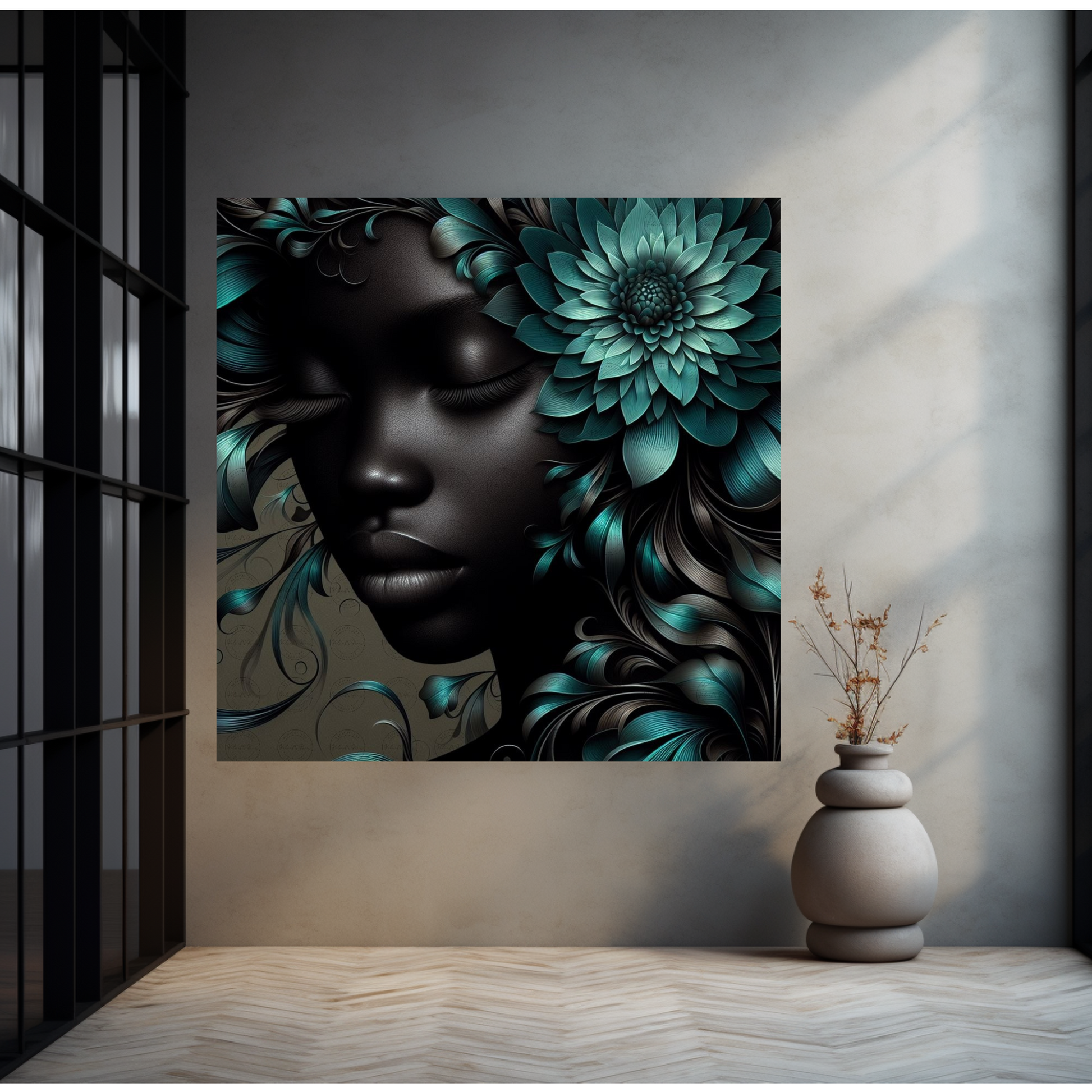 This captivating digital art piece, "Botanical Elegance: A Verdant Veil," portrays a serene and enigmatic figure whose visage is adorned with a lush, teal-hued floral arrangement. The central bloom, rich in detail and texture, acts as a natural crown, while the surrounding leaves drape gracefully across the subject's features, hinting at a connection between humanity and the natural world. The backdrop is subtly patterned with circular motifs that complement the organic theme, enhancing the overall mystique. This artwork is a celebration of nature's intricate beauty, seamlessly integrated with human grace, creating a timeless piece that speaks to the soul's affinity for the earth's flora.