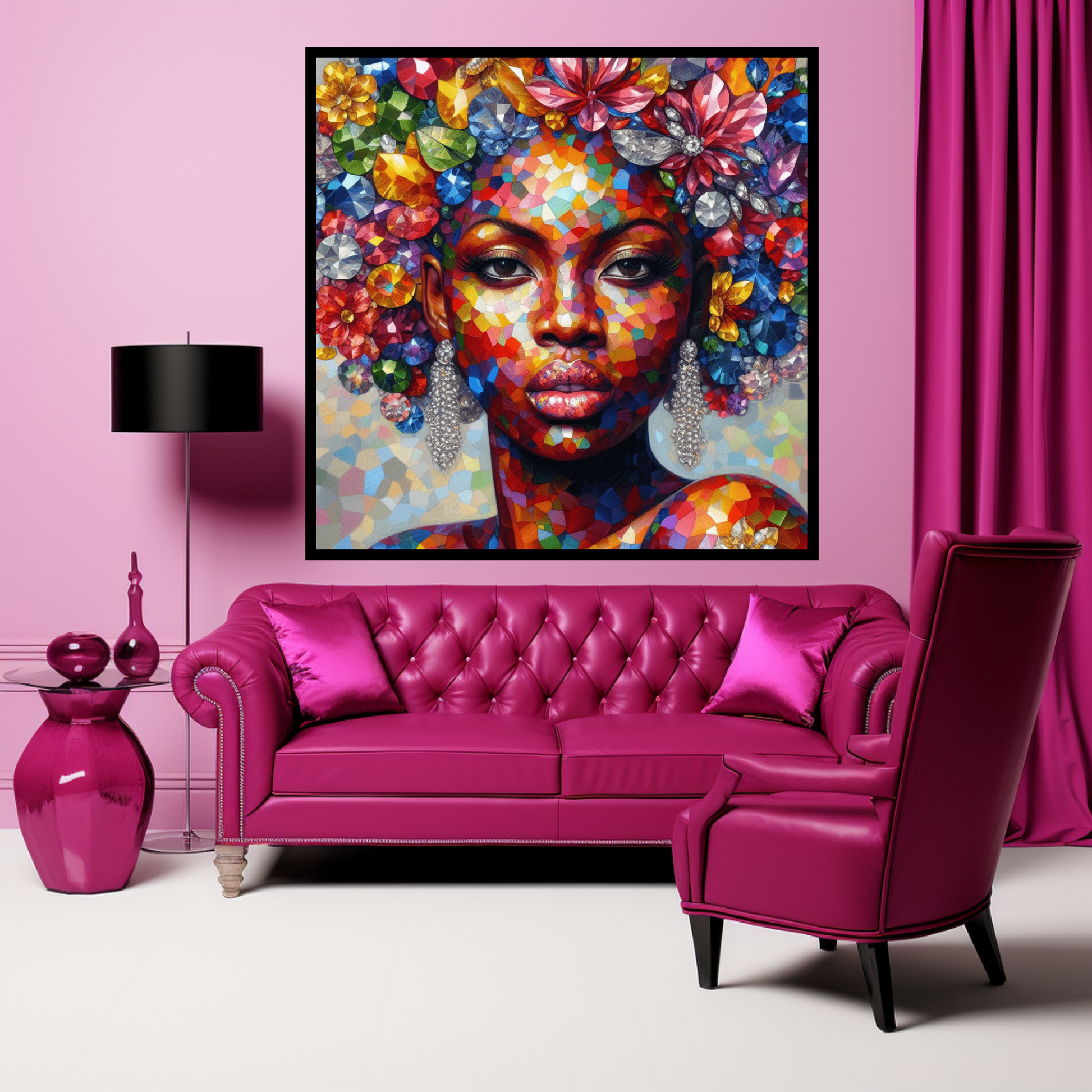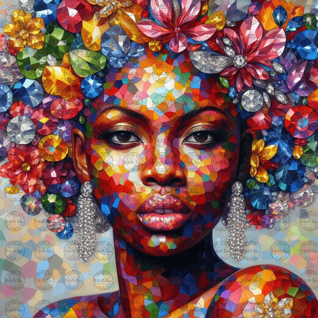 Digital Art - Crystal Radiance: An Urban Fairy Tale #2015 Crystal Radiance: An Urban Fairy Tale is a mesmerizing digital artwork that blends traditional African aesthetics with a fantastical urban narrative. This piece features a woman whose form is intricately composed of shimmering crystals, embodying the vibrancy and resilience of the African spirit. Her pose and expression are crafted to exude elegance and emotive depth, bringing forth a story of grace amidst the concrete jungle. The urban setting forms a stark but harmonious backdrop, with elements of a modern fairy tale woven through the scene. Skyscrapers blend with mythical motifs, creating a dreamscape where reality and fantasy intersect. Each crystal that forms the woman's figure catches the light differently, casting a kaleidoscope of colors that dance across the canvas. The fine details in her attire and surroundings are a testament to the highly detailed illustration style, which aims to capture not just the visual splendor, but also the soulful essence of its subject. This piece is a celebration of cultural heritage and contemporary imagination, making it a captivating addition to any collection of digital art. It speaks to the heart of those who find beauty in diversity and strength in the fusion of the old and the new. "Crystal Radiance" is more than just a visual treat; it's a journey into a world where every detail tells a part of a larger, enchanting story. You will receive one upscaled high quality PNG file that can be used for various projects.