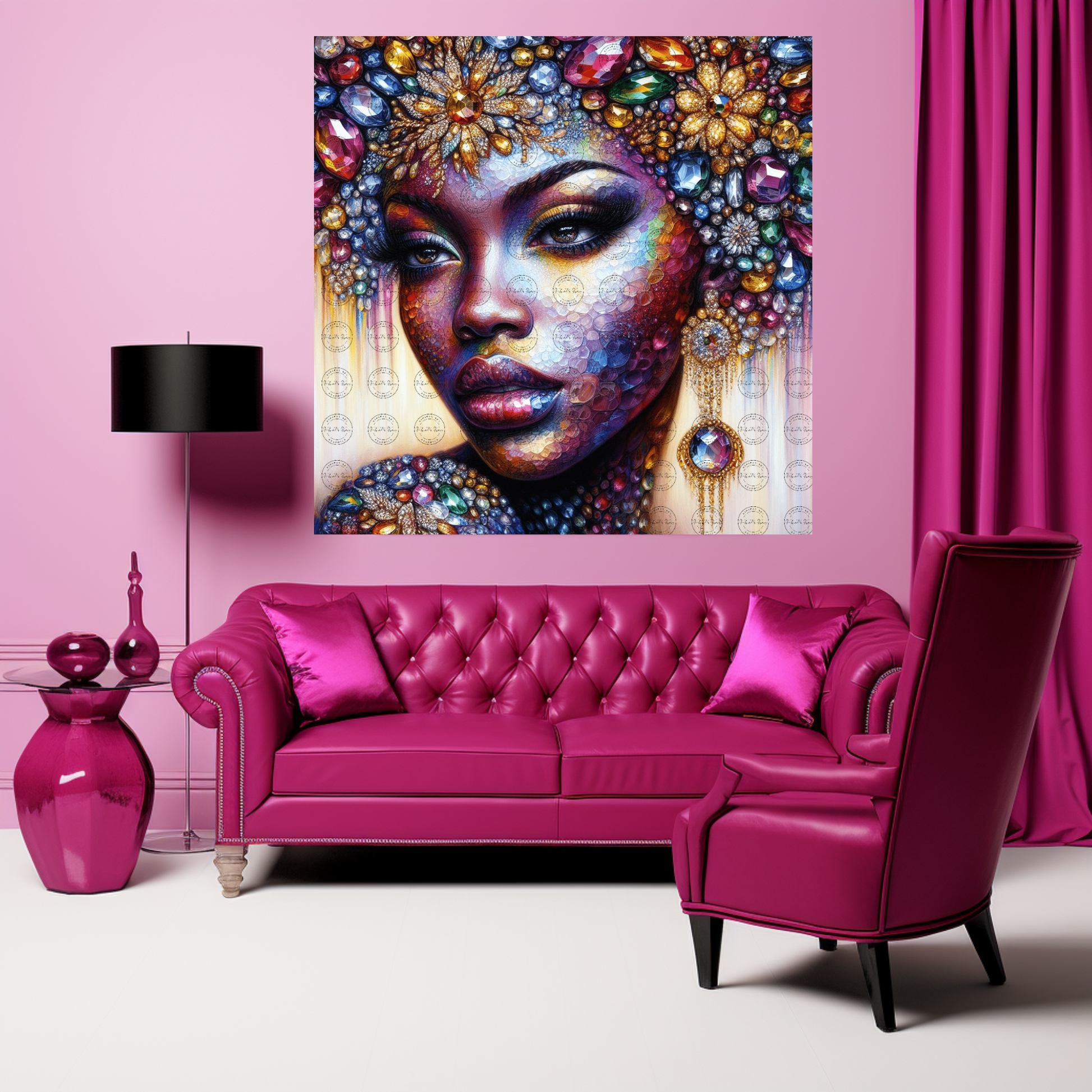 Digital Art - Crystal Radiance: An Urban Fairy Tale #2017 Crystal Radiance: An Urban Fairy Tale is a mesmerizing digital artwork that blends traditional African aesthetics with a fantastical urban narrative. This piece features a woman whose form is intricately composed of shimmering crystals, embodying the vibrancy and resilience of the African spirit. Her pose and expression are crafted to exude elegance and emotive depth, bringing forth a story of grace amidst the concrete jungle. The urban setting forms a stark but harmonious backdrop, with elements of a modern fairy tale woven through the scene. Skyscrapers blend with mythical motifs, creating a dreamscape where reality and fantasy intersect. Each crystal that forms the woman's figure catches the light differently, casting a kaleidoscope of colors that dance across the canvas. The fine details in her attire and surroundings are a testament to the highly detailed illustration style, which aims to capture not just the visual splendor, but also the soulful essence of its subject. This piece is a celebration of cultural heritage and contemporary imagination, making it a captivating addition to any collection of digital art. It speaks to the heart of those who find beauty in diversity and strength in the fusion of the old and the new. "Crystal Radiance" is more than just a visual treat; it's a journey into a world where every detail tells a part of a larger, enchanting story. You will receive one upscaled high quality PNG file that can be used for various projects.