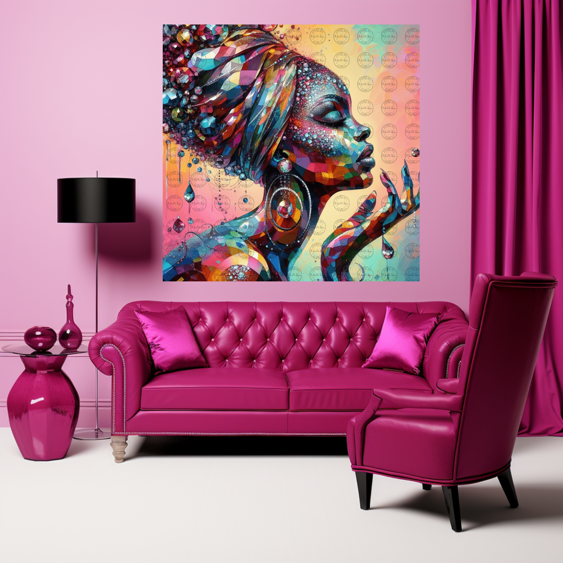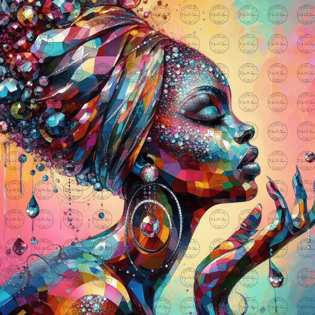 Digital Art - Crystal Radiance: An Urban Fairy Tale #2018 Crystal Radiance: An Urban Fairy Tale is a mesmerizing digital artwork that blends traditional African aesthetics with a fantastical urban narrative. This piece features a woman whose form is intricately composed of shimmering crystals, embodying the vibrancy and resilience of the African spirit. Her pose and expression are crafted to exude elegance and emotive depth, bringing forth a story of grace amidst the concrete jungle. The urban setting forms a stark but harmonious backdrop, with elements of a modern fairy tale woven through the scene. Skyscrapers blend with mythical motifs, creating a dreamscape where reality and fantasy intersect. Each crystal that forms the woman's figure catches the light differently, casting a kaleidoscope of colors that dance across the canvas. The fine details in her attire and surroundings are a testament to the highly detailed illustration style, which aims to capture not just the visual splendor, but also the soulful essence of its subject. This piece is a celebration of cultural heritage and contemporary imagination, making it a captivating addition to any collection of digital art. It speaks to the heart of those who find beauty in diversity and strength in the fusion of the old and the new. "Crystal Radiance" is more than just a visual treat; it's a journey into a world where every detail tells a part of a larger, enchanting story. You will receive one upscaled high quality PNG file that can be used for various projects.