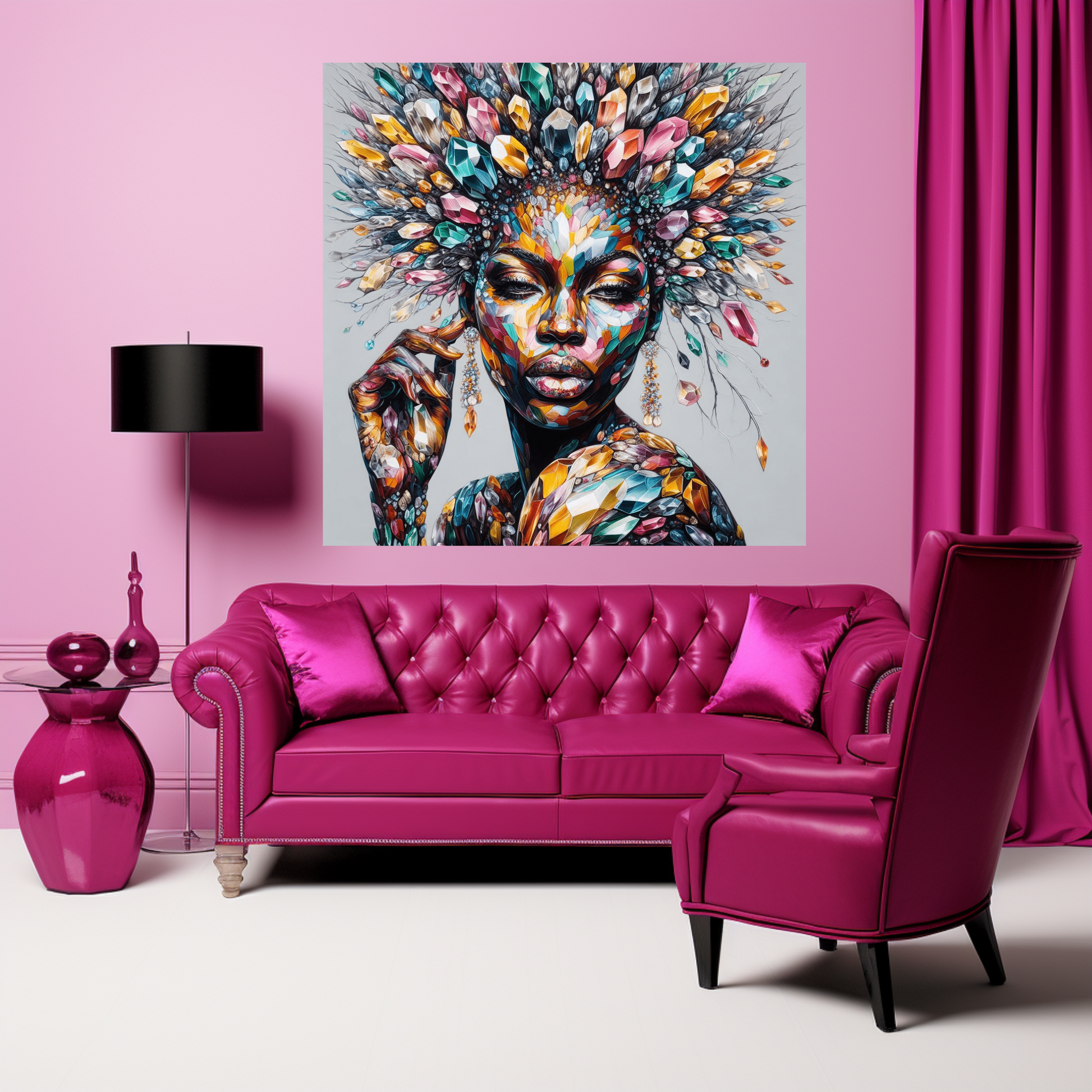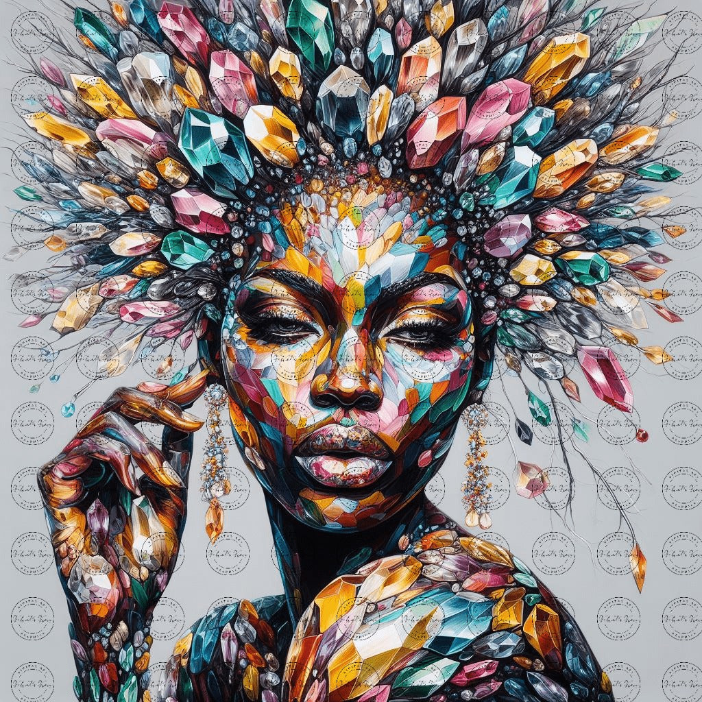 Digital Art - Crystal Radiance: An Urban Fairy Tale #2019 Crystal Radiance: An Urban Fairy Tale is a mesmerizing digital artwork that blends traditional African aesthetics with a fantastical urban narrative. This piece features a woman whose form is intricately composed of shimmering crystals, embodying the vibrancy and resilience of the African spirit. Her pose and expression are crafted to exude elegance and emotive depth, bringing forth a story of grace amidst the concrete jungle. The urban setting forms a stark but harmonious backdrop, with elements of a modern fairy tale woven through the scene. Skyscrapers blend with mythical motifs, creating a dreamscape where reality and fantasy intersect. Each crystal that forms the woman's figure catches the light differently, casting a kaleidoscope of colors that dance across the canvas. The fine details in her attire and surroundings are a testament to the highly detailed illustration style, which aims to capture not just the visual splendor, but also the soulful essence of its subject. This piece is a celebration of cultural heritage and contemporary imagination, making it a captivating addition to any collection of digital art. It speaks to the heart of those who find beauty in diversity and strength in the fusion of the old and the new. "Crystal Radiance" is more than just a visual treat; it's a journey into a world where every detail tells a part of a larger, enchanting story. You will receive one upscaled high quality PNG file that can be used for various projects.