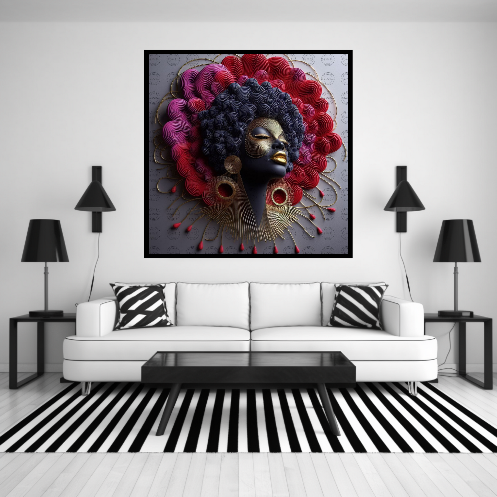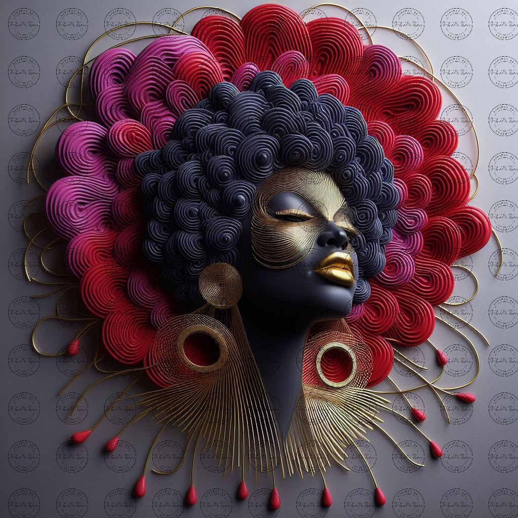 Digital Art - Elegance in Silence - #2017 These images present a side profile of a stylized woman's face, rendered with an exceptional blend of modern aesthetics and classical grace. Her skin is depicted in a smooth, gunmetal grey tone, creating a stark yet harmonious contrast against the crimson backdrop. A band of elegant, deep magenta wraps around her head, accentuating the sleek curvature of her form. This vibrant headpiece is matched by orbs and circles that cascade in a harmonious pattern to the left, mixing shades of the same magenta with charcoal greys, giving the impression of a futuristic, abstract headdress. A solitary teardrop in a rich ruby hue falls from the collection, symbolizing depth and emotion. The figure's features are highlighted with gold trim, providing a subtle warmth to the composition, while her closed eye with a singular, pronounced eyelash exudes a sense of peaceful introspection. Her full lips are tinted with a glossy red, drawing attention to her thoughtful expression. The image encapsulates a moment of serene reflection, wrapped in a luxurious palette of colors. You will receive one upscaled high quality PNG file that can be used for various projects.