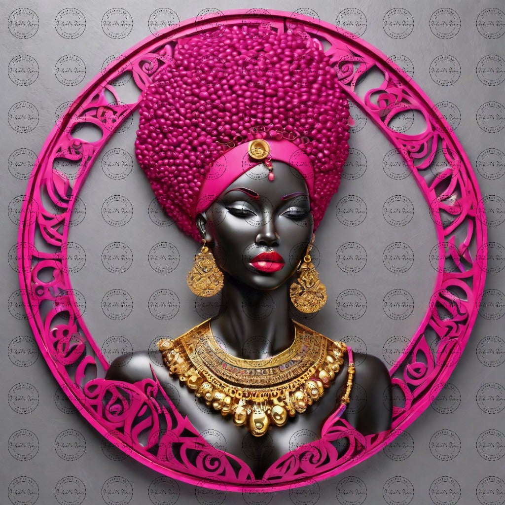 Digital Art - Elegance in Silence - #2020 These images present a side profile of a stylized woman's face, rendered with an exceptional blend of modern aesthetics and classical grace. Her skin is depicted in a smooth, gunmetal grey tone, creating a stark yet harmonious contrast against the crimson backdrop. A band of elegant, deep magenta wraps around her head, accentuating the sleek curvature of her form. This vibrant headpiece is matched by orbs and circles that cascade in a harmonious pattern to the left, mixing shades of the same magenta with charcoal greys, giving the impression of a futuristic, abstract headdress. A solitary teardrop in a rich ruby hue falls from the collection, symbolizing depth and emotion. The figure's features are highlighted with gold trim, providing a subtle warmth to the composition, while her closed eye with a singular, pronounced eyelash exudes a sense of peaceful introspection. Her full lips are tinted with a glossy red, drawing attention to her thoughtful expression. The image encapsulates a moment of serene reflection, wrapped in a luxurious palette of colors. You will receive one upscaled high quality PNG file that can be used for various projects.