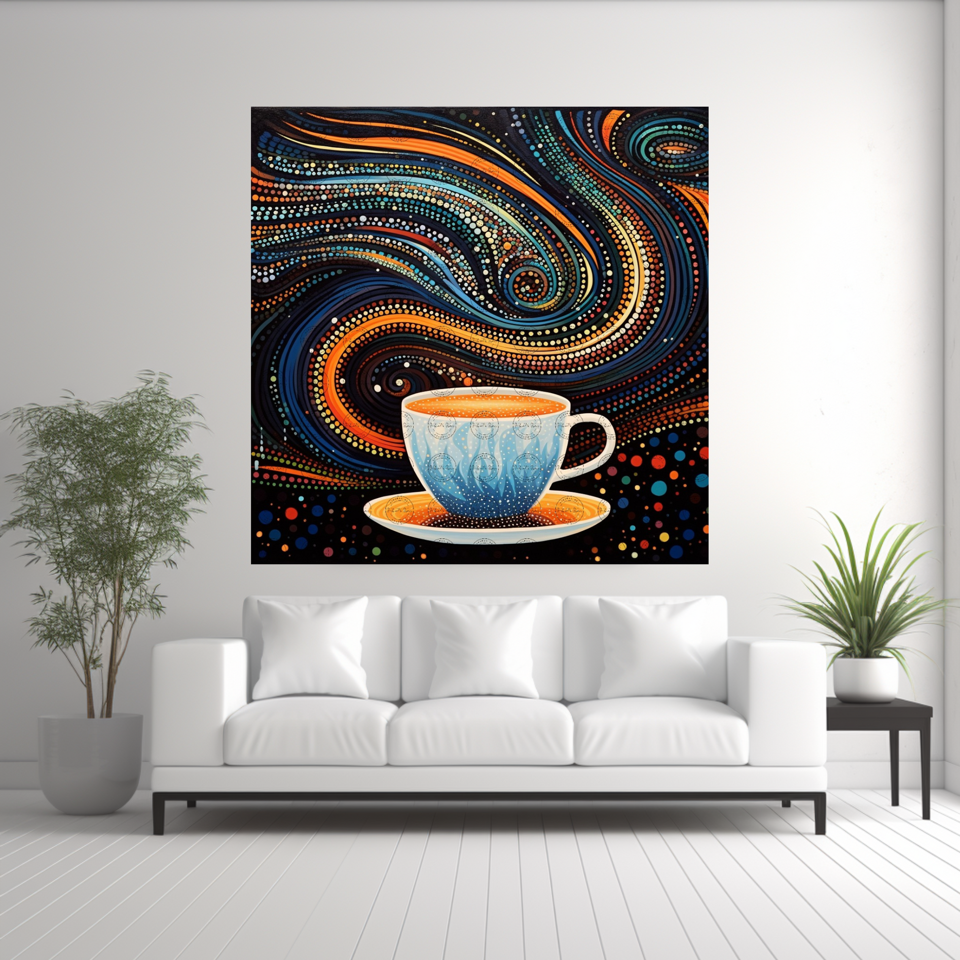 Digital Art - Moonlit Mocha Magic - #2017 Moonlit Mocha Magic is a captivating piece of digital art that marries the everyday charm of a coffee cup with the ethereal beauty of pointillist stippling. This artwork is a symphony of dots meticulously arranged to create serene, rounded forms reminiscent of stencil-like imagery. The whimsical coffee cup at the center is more than a vessel; it's a portal to a magical, abstract world. The use of a Christmas palette infuses the scene with a surreal, festive warmth, blending shades of deep greens, rich reds, and frosty whites. These colors dance across the canvas, evoking the cozy ambiance of a moonlit winter night. The moonlight itself is masterfully rendered through subtle gradations of light and shadow, lending the piece an otherworldly glow. Patterns within this artwork are both abstract and precise, playing a delightful game of hide and seek with the viewer's eye. Every dot and every hue work in harmony to create a surreal landscape that is both familiar and fantastical. This digital print is a testament to the magic that can be found in the ordinary, transforming a simple coffee cup into a vessel of dreams and nocturnal wonder. Perfect for art enthusiasts who appreciate the surreal and whimsical, "Moonlit Mocha Magic" is a unique addition to any collection, inviting viewers to lose themselves in its serene, pointillist world. You will receive one upscaled high quality PNG or JPEG file that can be used for various projects.