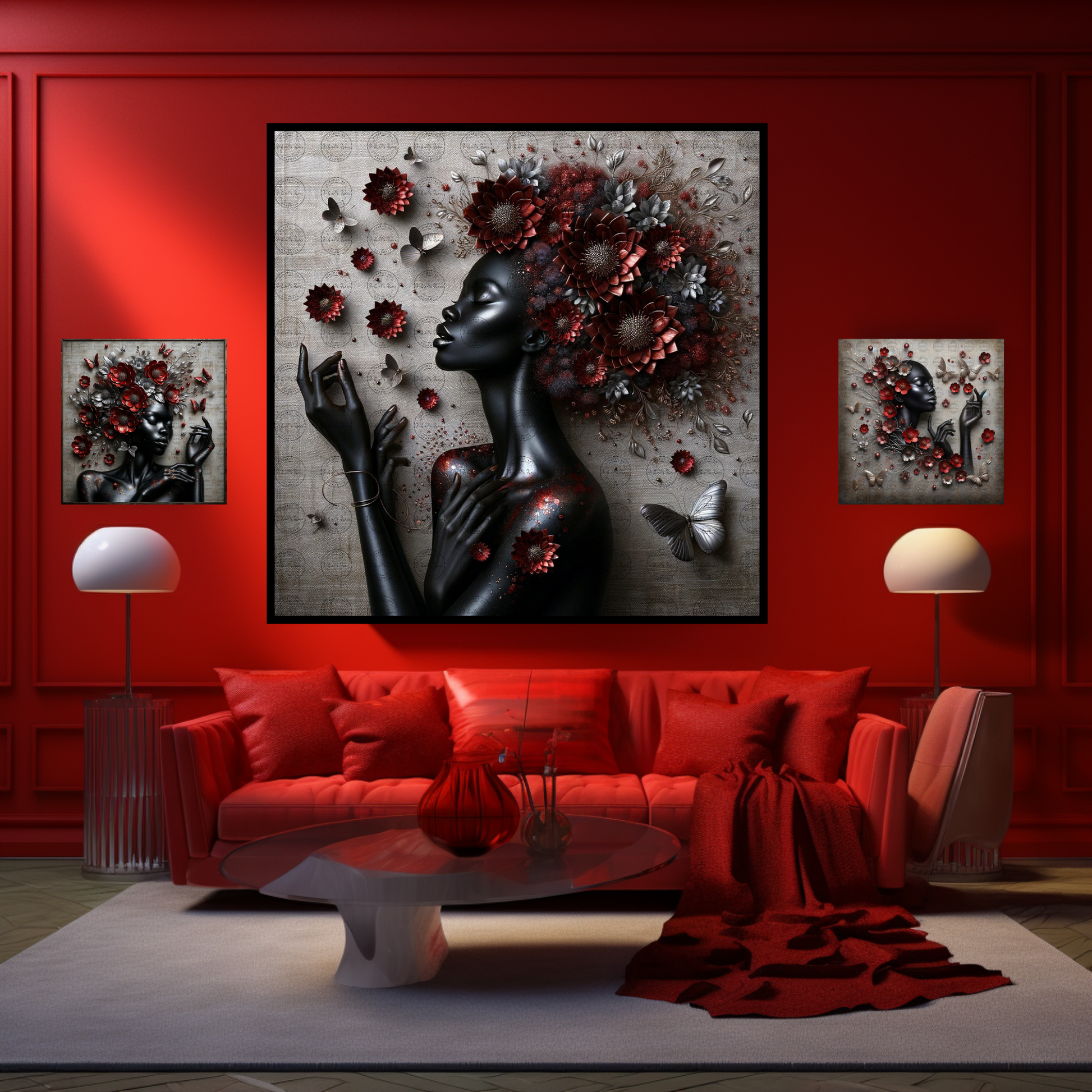 Digital Art - Ethereal Bloom - #2019 "Ethereal Bloom" is a stunning digital art piece that captures the serene beauty of a Black woman in repose, her polished, obsidian-like complexion forming a striking contrast with the vibrant cascade of purple metallic flowers adorning her. Each petal, rendered with a reflective sheen, seems to absorb, and re-emit the light around her, creating a dance of luminance that gives life to the composition. Her peaceful expression, framed by the rich blooms, invites a sense of calm introspection, while her elegantly positioned hands reach out, connecting with the tranquil world she embodies. Delicate yellow butterflies, with wings that resonate with the floral motif, add a touch of gentle motion, symbolizing freedom and grace. Set against a textured canvas that suggests the grandeur of a luxurious tapestry, the artwork is sprinkled with tiny flecks of pink leaf, drawing a connection between the woman and the surrounding natural elements. This detail emphasizes the opulent aesthetic of the piece, bridging the gap between the subject and her environment in a celebration of natural beauty and artful elegance. You will receive one upscaled high quality PNG file that can be used for various projects.