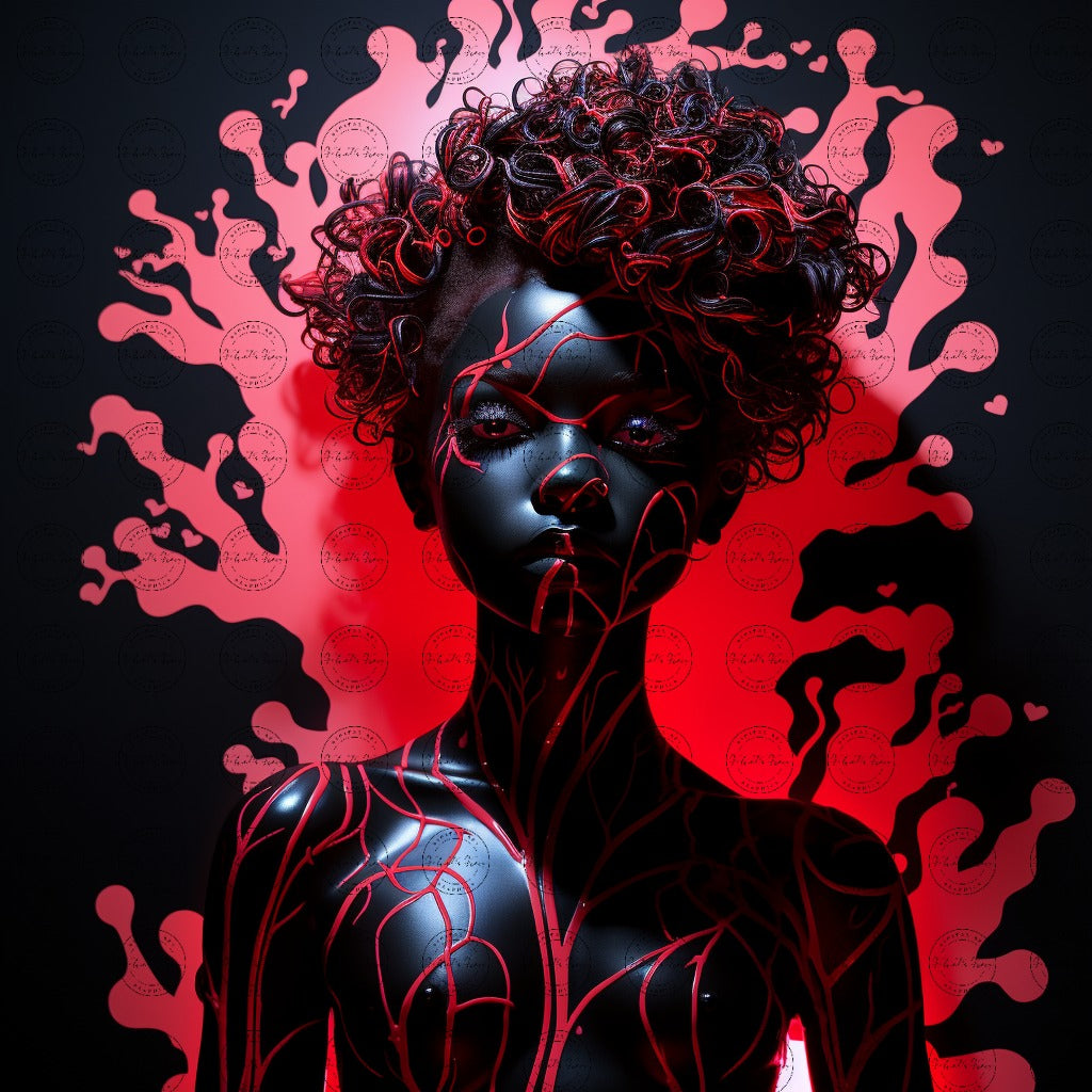 Digital Art - Ethereal Harmony: A Silhouette of Little Black Girl - #2012 "Ethereal Harmony" is a mesmerizing digital artwork by Gregoire Guillemin that seamlessly blends the beauty of traditional puffy paint painting with a contemporary silhouette aesthetic. In this artwork, a little black girl is depicted in a silhouette against a background inspired by vaporwave aesthetics. The silhouette is meticulously crafted with micro-details, capturing the innocence and wonder in her expression. The studio lighting accentuates the subtle curves of her face and the intricate details of her hair, adding depth to the artwork. The use of red hues creates a striking contrast against the vaporwave background, symbolizing passion and strength. Inspired by the iconic style of "The Tree of Life" film and the vibrant aesthetics of the Persona 5 video game, this artwork combines elements of cinematic storytelling and video game artistry. The composition exudes a sense of mystery and adventure, inviting viewers to delve into the girl's world and explore the depths of her imagination. Version 5.2 of this artwork signifies the evolution of Guillemin's artistic vision, incorporating new techniques and styles. "Ethereal Harmony" invites viewers to contemplate the intersection of innocence and strength, tradition and modernity, in a visually stunning and emotionally resonant masterpiece. You will receive one upscaled high quality PNG file that can be used for various projects.