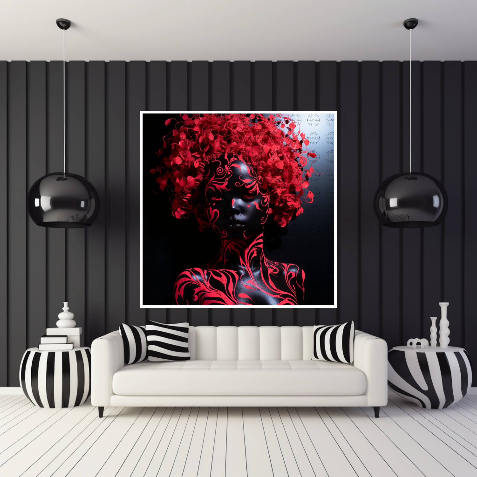Digital Art - Ethereal Harmony: A Silhouette of Little Black Girl - #2013 "Ethereal Harmony" is a mesmerizing digital artwork by Gregoire Guillemin that seamlessly blends the beauty of traditional puffy paint painting with a contemporary silhouette aesthetic. In this artwork, a little black girl is depicted in a silhouette against a background inspired by vaporwave aesthetics. The silhouette is meticulously crafted with micro-details, capturing the innocence and wonder in her expression. The studio lighting accentuates the subtle curves of her face and the intricate details of her hair, adding depth to the artwork. The use of red hues creates a striking contrast against the vaporwave background, symbolizing passion and strength. Inspired by the iconic style of "The Tree of Life" film and the vibrant aesthetics of the Persona 5 video game, this artwork combines elements of cinematic storytelling and video game artistry. The composition exudes a sense of mystery and adventure, inviting viewers to delve into the girl's world and explore the depths of her imagination. You will receive one upscaled high quality PNG file that can be used for various projects.