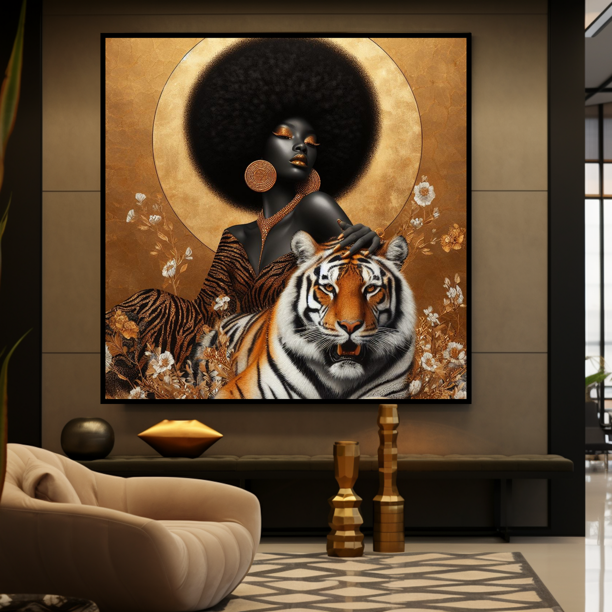 This mesmerizing digital artwork, rendered in stunning 8K resolution, harmoniously blends realism, bio-art, and elements of Angura Kei in a captivating visual narrative. In this piece, a resplendent black Afro girl dons a gown of liquid gold, symbolizing her regality and strength. Standing proudly beside her is a majestic tiger, also adorned in golden hues, signifying power and wild beauty. The artwork, inspired by the styles of acclaimed artists Anne Stokes, Flora Borsi, and Jessica Drossin, incorporates vibrant portraits and furry art techniques, bringing life to the characters. The use of dark white and orange tones creates a striking contrast, emphasizing the richness of the African woman's skin and the tiger's fur. The composition is infused with symbolic imagery, exploring the deep connection between humanity and nature. Sgrafitto and neo-mosaic elements add texture and depth, enhancing the visual experience. The framing of the scene captures the essence of Anne Stokes' fantasy worlds, where mythical creatures and humans coexist in harmony. "Ethereal Unity" invites viewers into a realm where cultures intertwine, and the bond between humans and the animal kingdom is celebrated. Through this artwork, the Afro Queen and her feline sovereign stand as symbols of resilience, grace, and the untamed spirit, inviting observers to contemplate the beauty of diversity and the strength found in unity. You will receive one upscaled high quality PNG file that can be used for various projects.