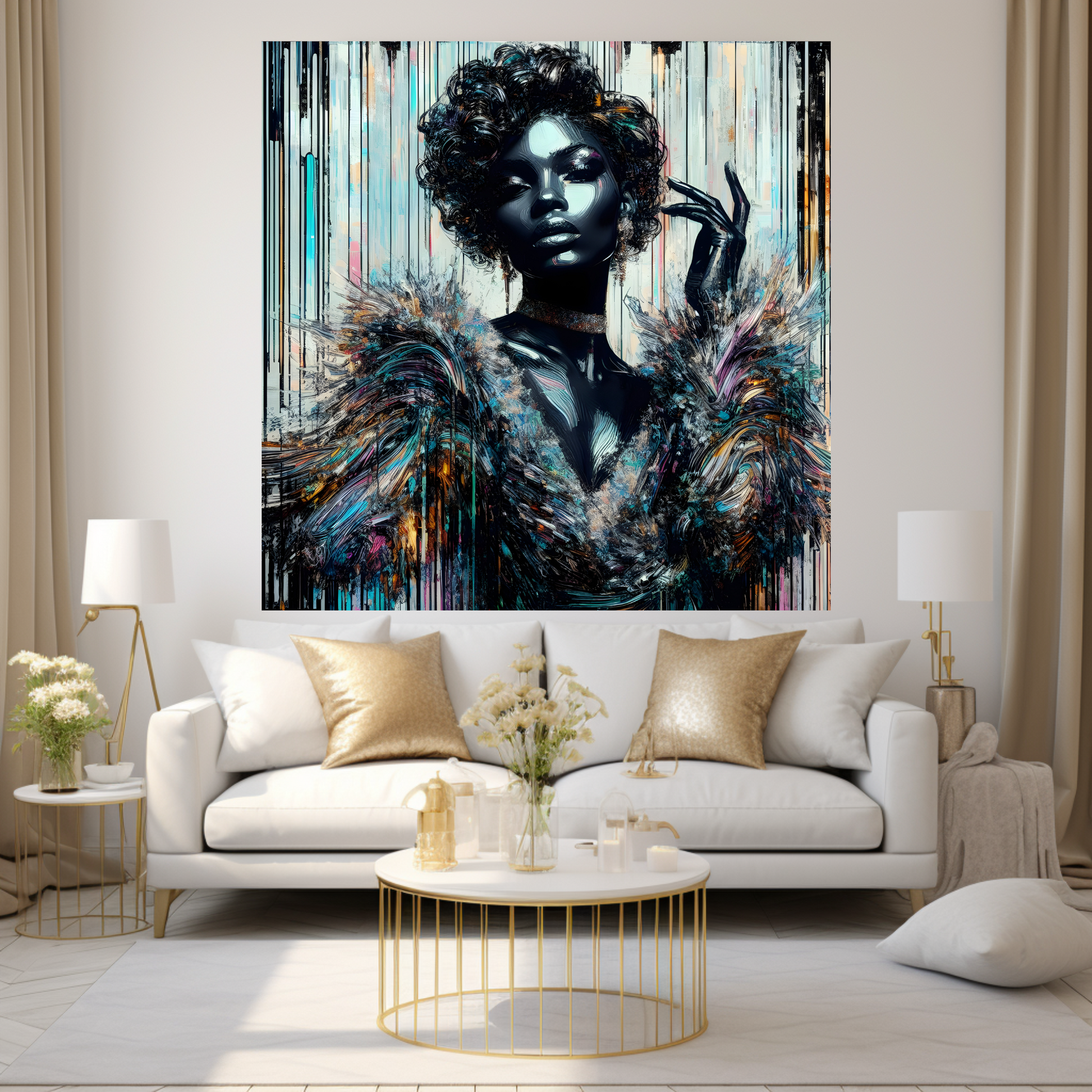 Vivid Elegance: Neo-Expressionist Fusion is a remarkable digital artwork that features a glamorous black model set against a mesmerizing, acid wave-inspired glass backdrop. The artwork is a masterful display of luxurious impasto textures, bringing the model to life with a tangible sense of depth and richness. This piece skillfully combines elements of retro fashion and punk grit, infused with a bold neo-expressionist twist. The edgy and abstract composition is further enhanced by hints of pop art aesthetics, creating a visually striking tableau. The beauty of the model is emphasized through the use of vivid colors and bold brushstrokes, capturing her elegance and strength in every detail. The artwork is a celebration of modern fashion and art, blending various styles to create a captivating and unique visual experience that challenges traditional boundaries and inspires admiration. You will receive one upscaled high quality PNG or JPEG file that can be used for various projects.
