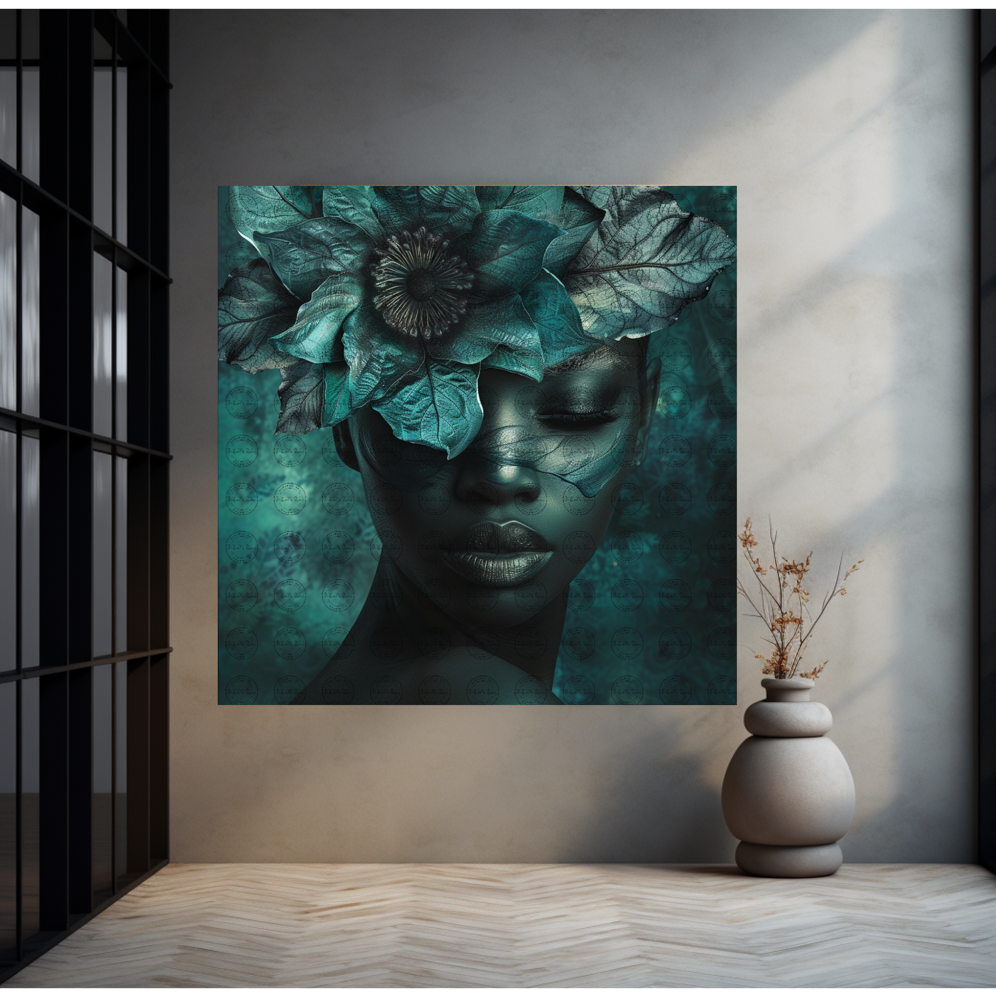 This captivating digital art piece, "Botanical Elegance: A Verdant Veil," portrays a serene and enigmatic figure whose visage is adorned with a lush, teal-hued floral arrangement. The central bloom, rich in detail and texture, acts as a natural crown, while the surrounding leaves drape gracefully across the subject's features, hinting at a connection between humanity and the natural world. The backdrop is subtly patterned with circular motifs that complement the organic theme, enhancing the overall mystique. This artwork is a celebration of nature's intricate beauty, seamlessly integrated with human grace, creating a timeless piece that speaks to the soul's affinity for the earth's flora.