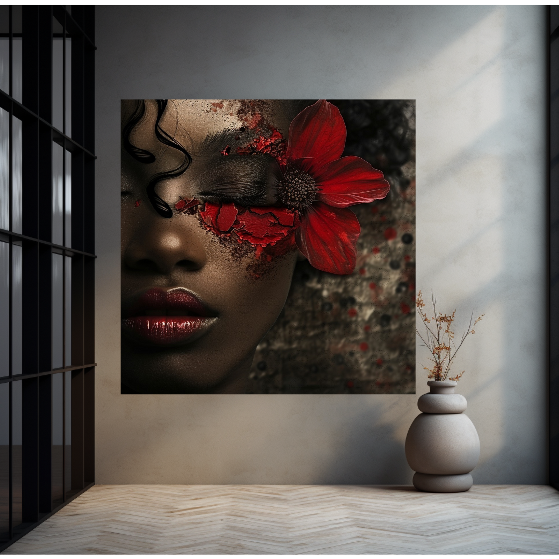 This captivating digital art piece, "Botanical Elegance: A Verdant Veil," portrays a serene and enigmatic figure whose visage is adorned with a lush, teal-hued floral arrangement. The central bloom, rich in detail and texture, acts as a natural crown, while the surrounding leaves drape gracefully across the subject's features, hinting at a connection between humanity and the natural world. The backdrop is subtly patterned with circular motifs that complement the organic theme, enhancing the overall mystique. This artwork is a celebration of nature's intricate beauty, seamlessly integrated with human grace, creating a timeless piece that speaks to the soul's affinity for the earth's flora.
