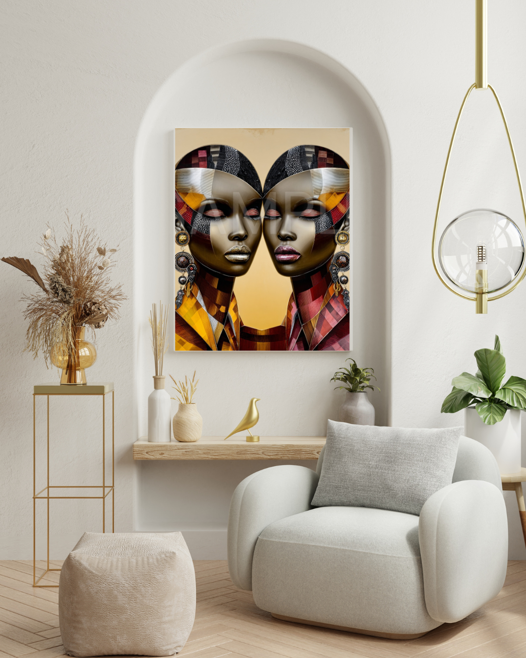 Step into a realm of regal abstraction where heritage meets high fashion. “Fractured Royalty” is a striking digital art series celebrating the beauty and depth of Black women through bold lines, patchwork textures, and modernist elegance. Each piece is a symphony of metallic gold, velvet rust, obsidian black, and ivory white — blending cracked surfaces, geometric symmetry, and couture-style silhouettes. 🎨✨